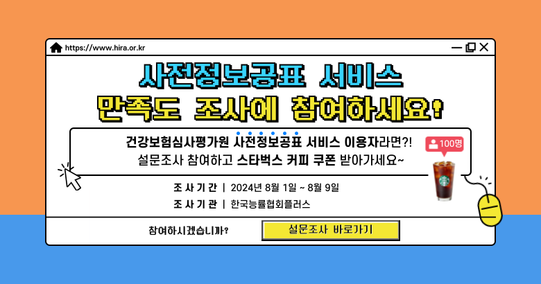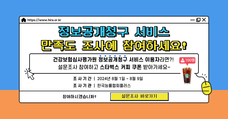 건강보험심사평가원은 국민이 원하는 최적의 서비스를 제공하기 위해 현재 제공 중인 서비스를 평가하고, 이를 토대로 콘텐츠의 품질개선 및 서비스의 질을 향상시키고자 건강보험심사평가원 홈페이지의 정보공개 서비스 이용 고객을 대상으로 아래와 같이 만족도 조사를 실시하오니 많은 참여 바랍니다.