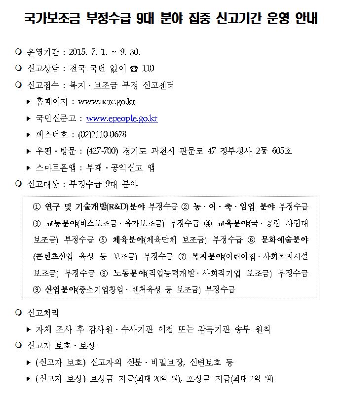 보조금 부정수급 9대 분야 집중 신고기간 운영 안내 글읽기