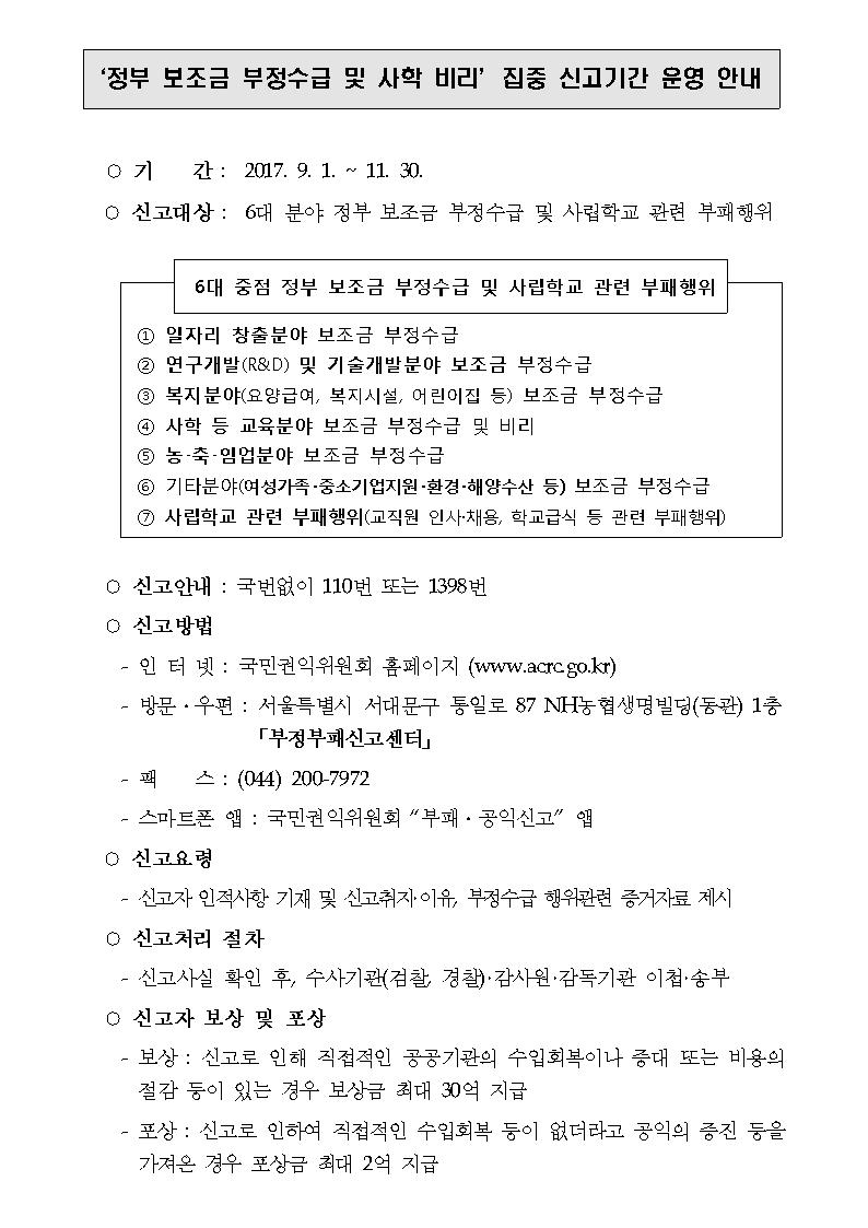 '정부 보조금 부정수급 및 사학 비리' 집중신고기간 운영 안내